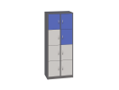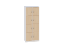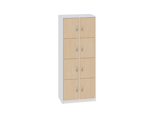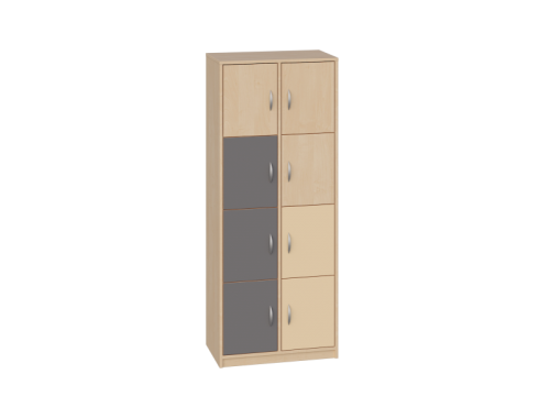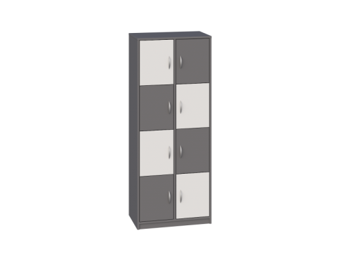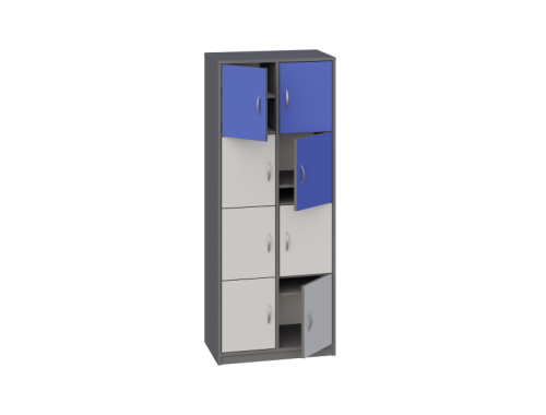 - Posiada 1 przegrodę i 6 półek, które tworzą 8 schowków do przechowywania, zamykane drzwiczkami bez zamka.