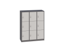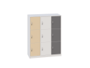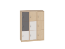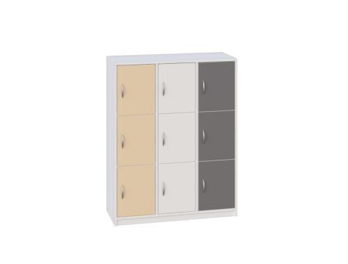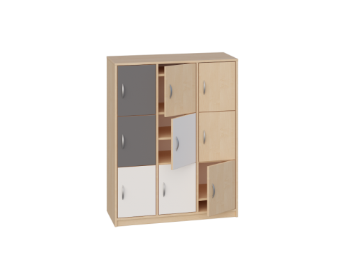 - Posiada 2 przegrody i 6 półek, które tworzą 9 schowków do przechowywania, zamykane drzwiczkami bez zamka.